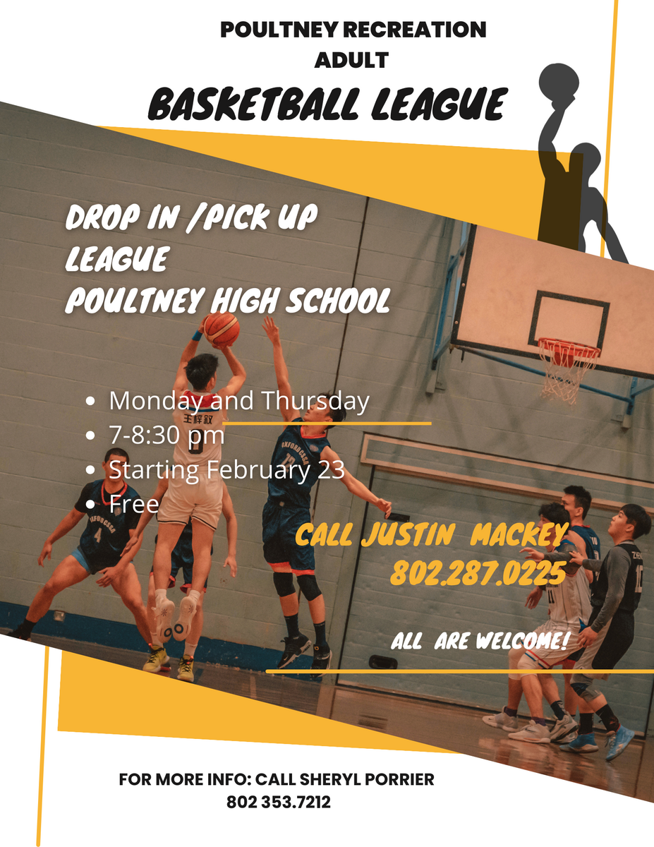 Adult Basketball League at Poultney High School Gym. Contact Justin Mackey at 802.287.0225.